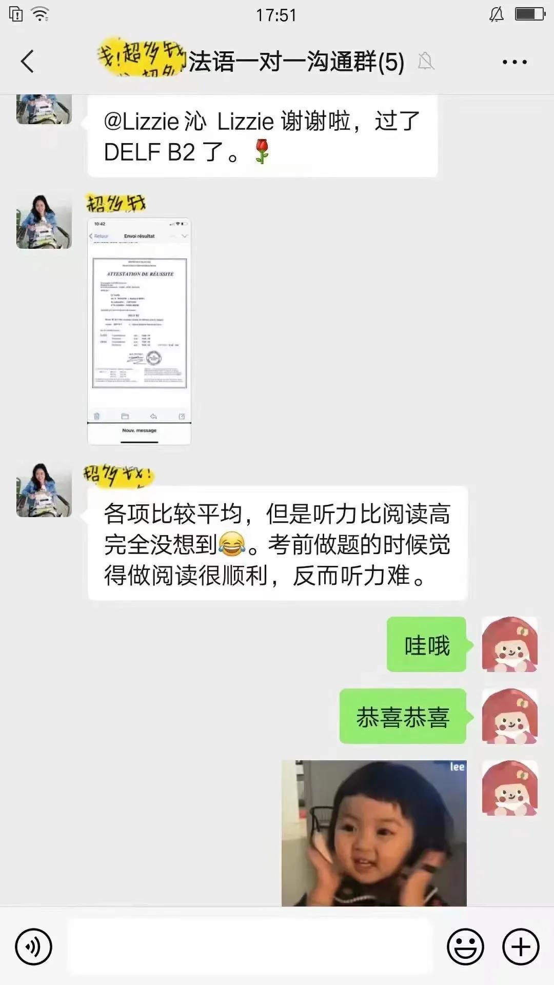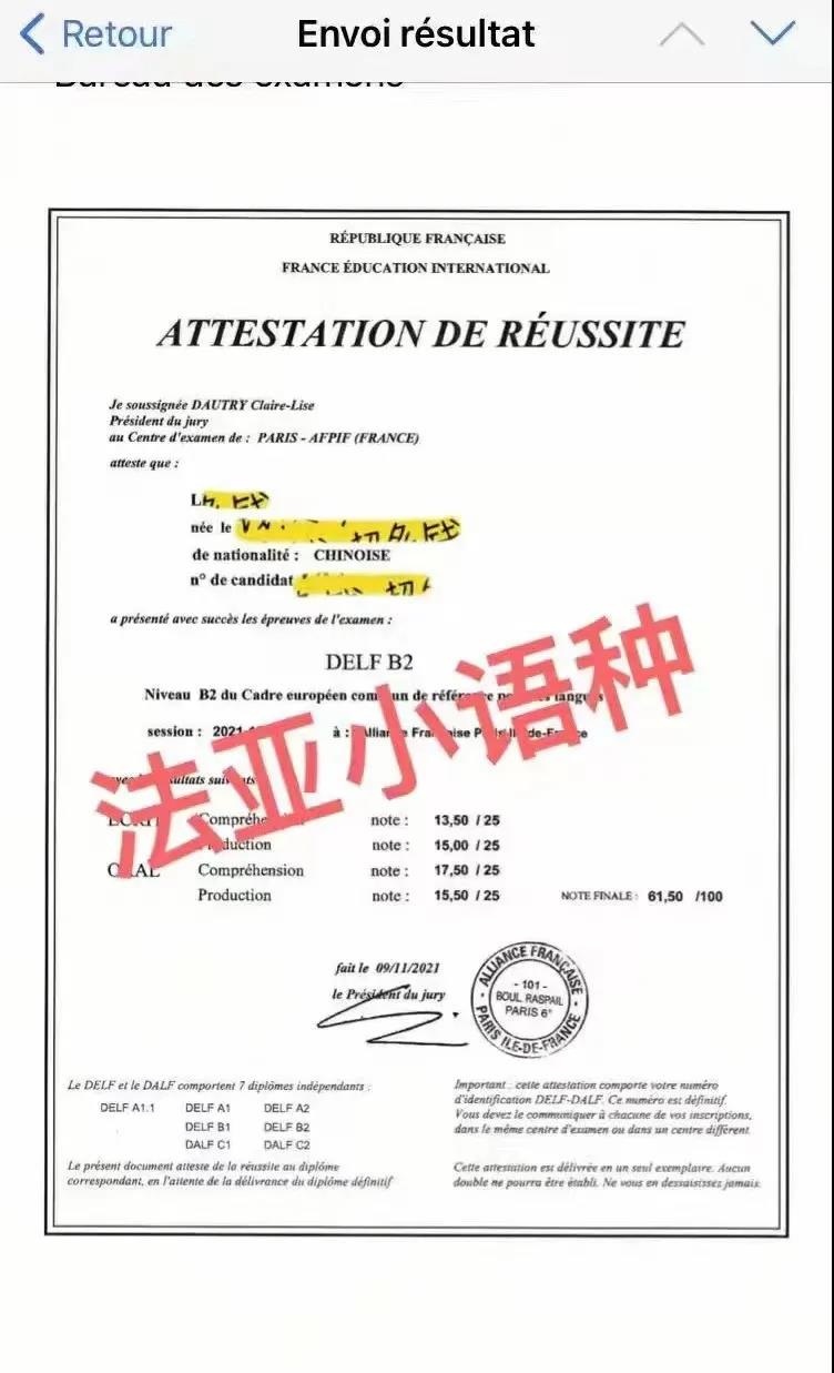 李同學(xué)18年就在法亞報(bào)名學(xué)習(xí)法語,從零基礎(chǔ)的班級(jí)學(xué)起,歷經(jīng)A1、A2、B1(雖然中途幾年在法國求學(xué),英語授課學(xué)習(xí),也并沒荒廢法語),今年8月報(bào)名B2一對(duì)一課程,短短兩個(gè)月通過沖刺技巧的培訓(xùn),順利取得了法語的中級(jí)證書。