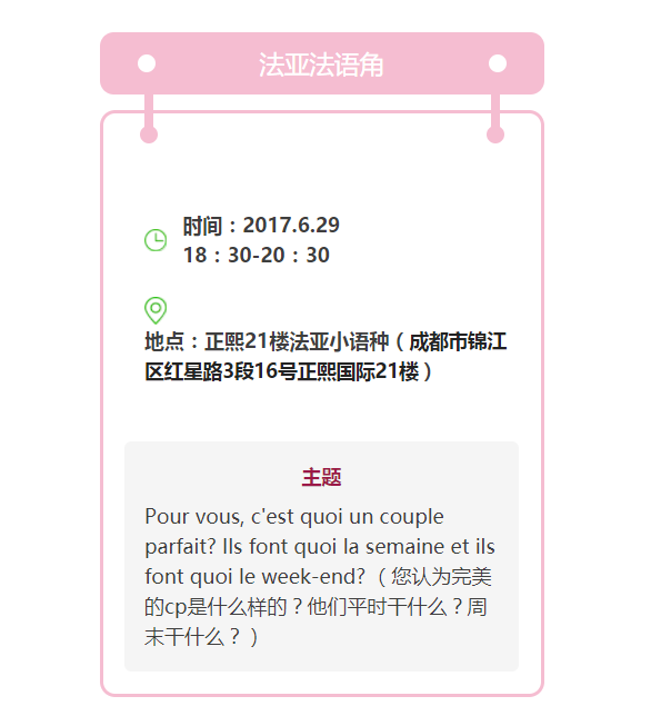 是不是很好奇大家都在聊什么呢~下一次就來(lái)參加吧!還有非常重要的就是大家對(duì)法語(yǔ)角的主題可以踴躍的提議哦~還沒(méi)有趕上的快去關(guān)注我們的微信公眾平臺(tái)一起參加起來(lái)吧~