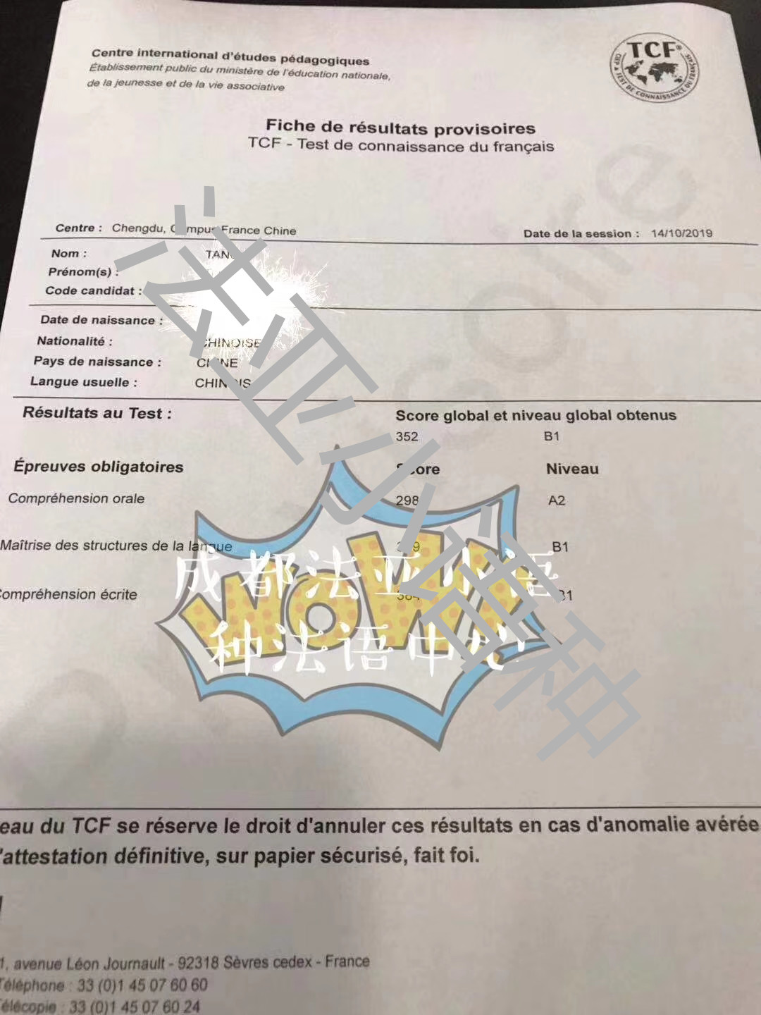 考試類型:TCF所報(bào)課程:法語(yǔ)出國(guó)班法語(yǔ)唐同學(xué)喜獲TCF B1成績(jī)