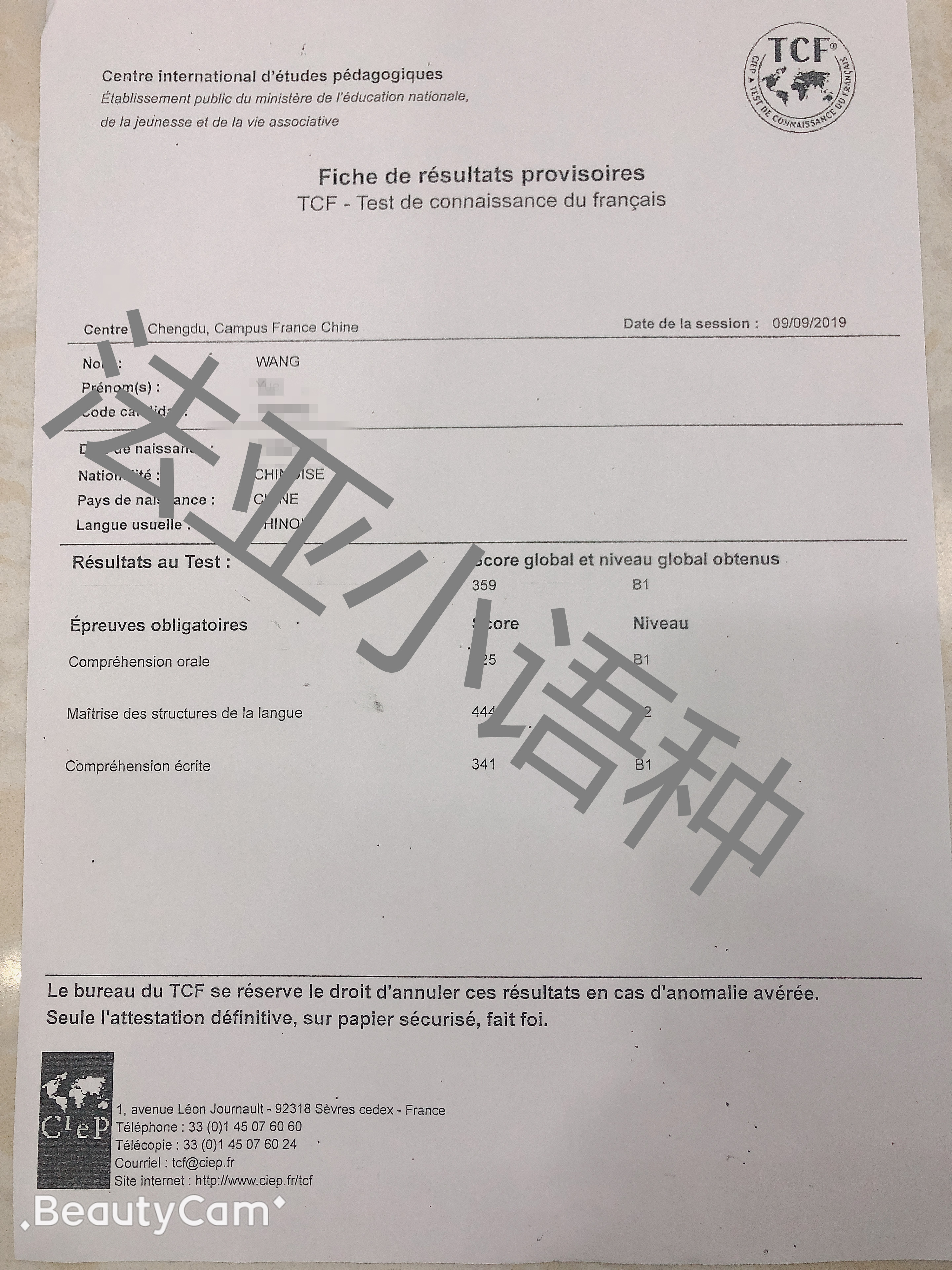 考試類型:TCF B1 所報(bào)課程:法語出國班恭喜法語王悅同學(xué)喜提t(yī)cf B1成績