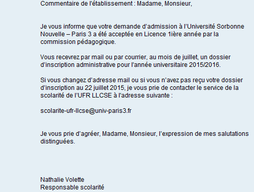 李柔竹索邦大學(xué)(巴黎第三大學(xué)應(yīng)用外語(yǔ)專業(yè))錄取確認(rèn)函