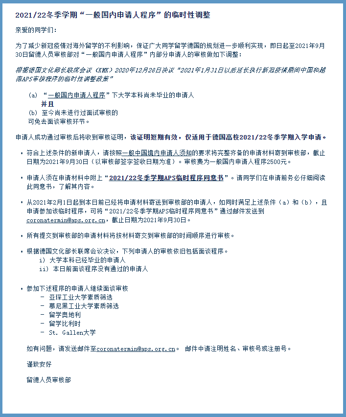根據(jù)德國(guó)文化部長(zhǎng)聯(lián)席會(huì)議(KMK)2020年12月28日決議“2021年1月31日以后延長(zhǎng)執(zhí)行新冠疫情期間中國(guó)和越南APS審核程序的臨時(shí)性調(diào)整政策”