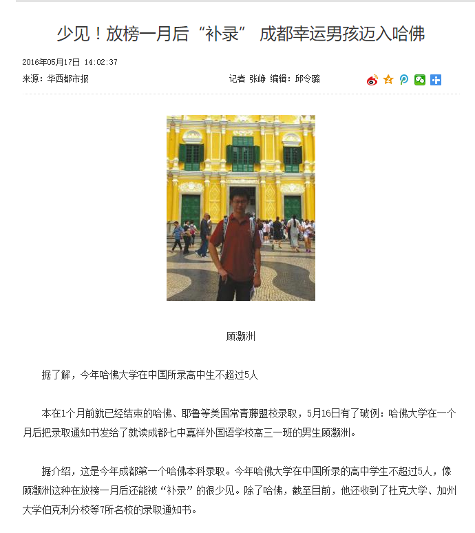 唉,不是我說,今日頭條就是夸張,什么叫“天大奇跡”,成都男孩被哈佛錄取就叫奇跡了嗎?像洲洲同學(xué)這么優(yōu)秀的藍孩紙就應(yīng)該被哈佛這樣的好學(xué)校錄取嘛。