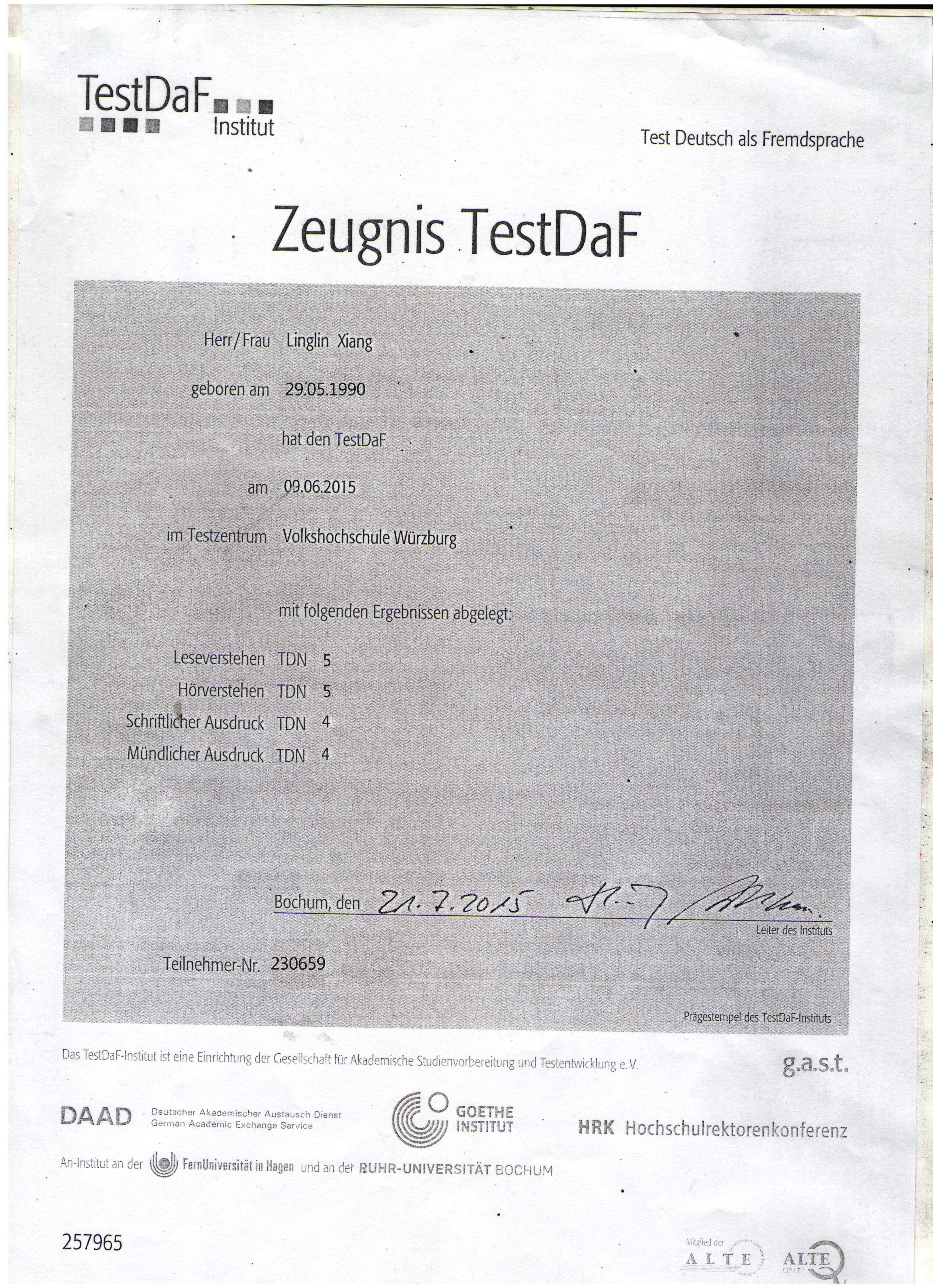 考試類型:Test-daf所報(bào)課程:出國班、VIP法亞德語大師兄德??剂藵M分了??!我的天,小編我打字的時(shí)候手都是抖的!