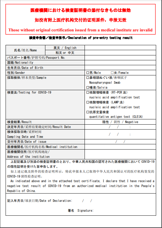 從中國出國前72小時之內(nèi)(注1)在中國取得進(jìn)行COVID-19檢測后證明為陰性的“檢測證明”(中文出具可)。根據(jù)“檢測證明”,需要填寫“檢查申報書”(注2)?!皺z測證明”除紙質(zhì)版出具的可以認(rèn)可外,電子郵件等收到結(jié)果的版本(復(fù)印件)也能認(rèn)可,但必須自行打印到紙面上連同“檢查申報書”一起提交給檢疫官。