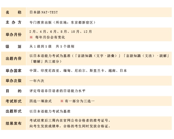 “日本語(yǔ) NAT-TEST”是面向母語(yǔ)非日語(yǔ)的日語(yǔ)學(xué)習(xí)者,判定其日語(yǔ)能力的考試。定位主要是針對(duì)赴日留學(xué)者及想在日本就業(yè)人員的能力鑒定考試。結(jié)合難度分為五個(gè)級(jí)別,通過(guò)“文字?語(yǔ)彙”(文字詞匯)、“聴解”(聽(tīng)解)、“読解”(讀解)三部分考試進(jìn)行綜合地評(píng)價(jià)。出題的標(biāo)準(zhǔn)和構(gòu)成與“日語(yǔ)能力考試”(日能)基本相同。自2007年舉辦以來(lái),各國(guó)的日語(yǔ)學(xué)習(xí)者及赴日留學(xué)人群為提高日語(yǔ)能力而不斷參與此項(xiàng)考試。