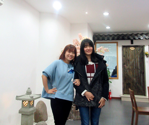 勾亞姍與法亞西班牙語老師鐘老師的課間合影。