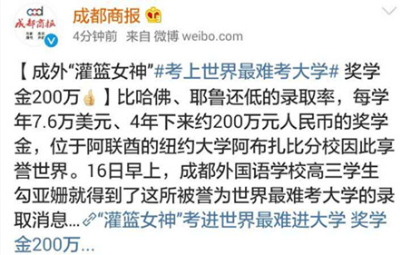 今天,一條【成都女生被全球“最難考大學(xué)”錄取】的新聞火爆了微博,微信和各大門戶網(wǎng)站,而這位18歲的成都女生和法亞也有千絲萬縷的關(guān)系。