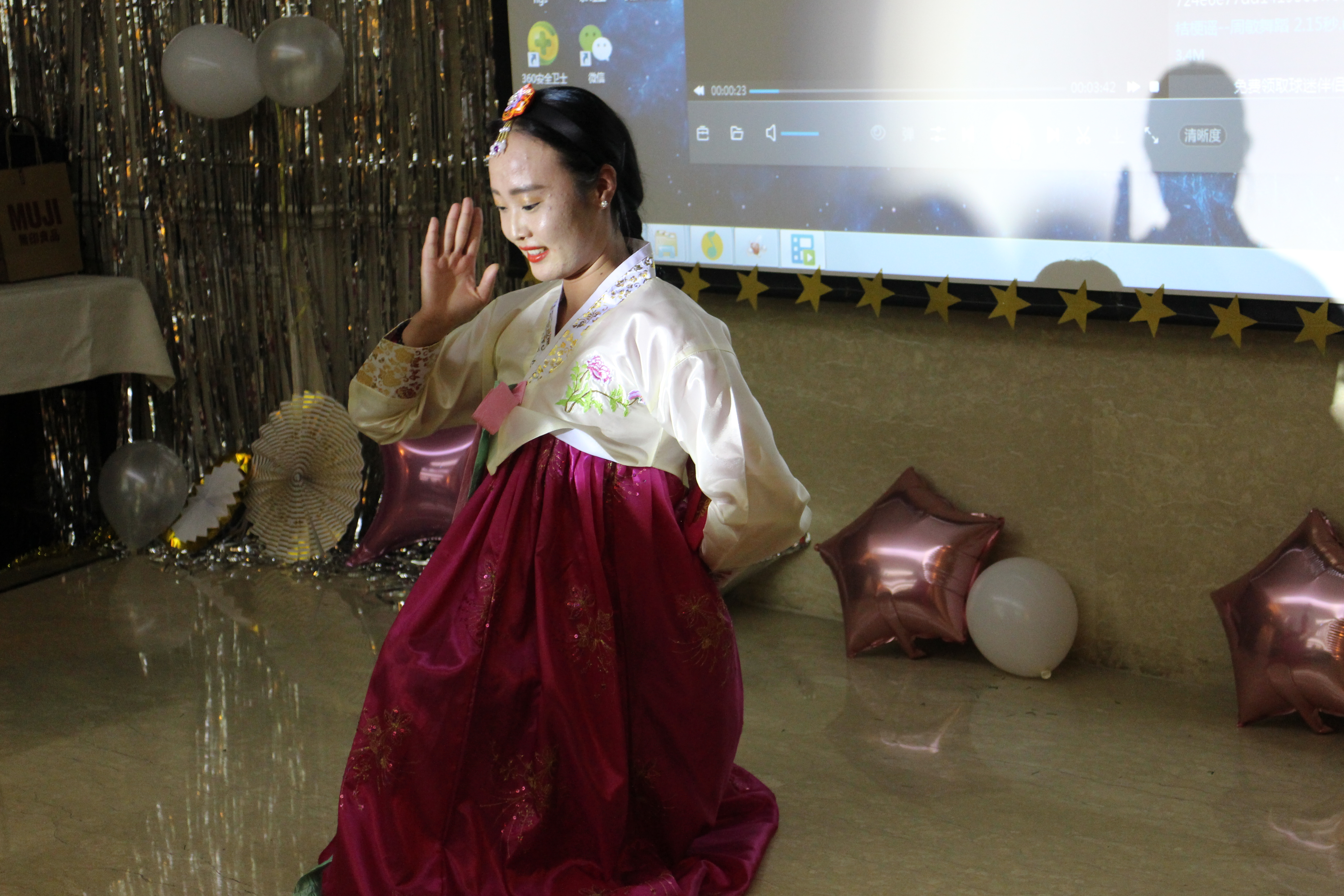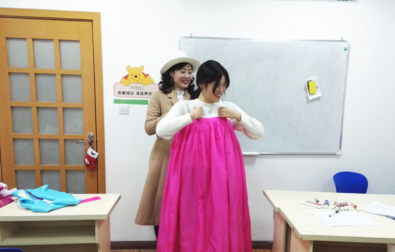 這次展示課,周敏老師還邀請了韓語外教老師,在外教老師的幫助下,同學(xué)們更加身臨其境了。一起感受了不一樣的韓服和韓國禮儀。