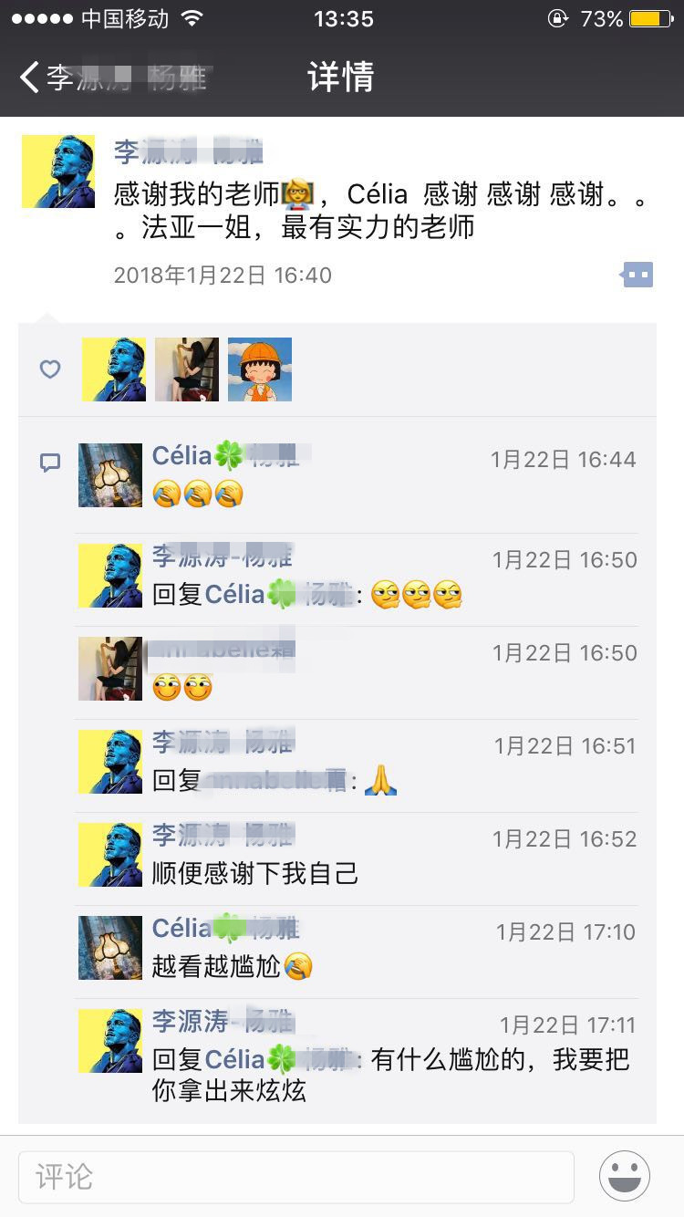 這位李同學(xué)是法語(yǔ)組楊雅老師班上的小可愛(ài)啦~經(jīng)過(guò)幾個(gè)月的學(xué)習(xí),拿到了滿(mǎn)意的成績(jī)單,忍不住要將這個(gè)好消息告訴全世界!當(dāng)然還要向全世界給我們的楊雅老師表白啦~楊老師辛苦啦~