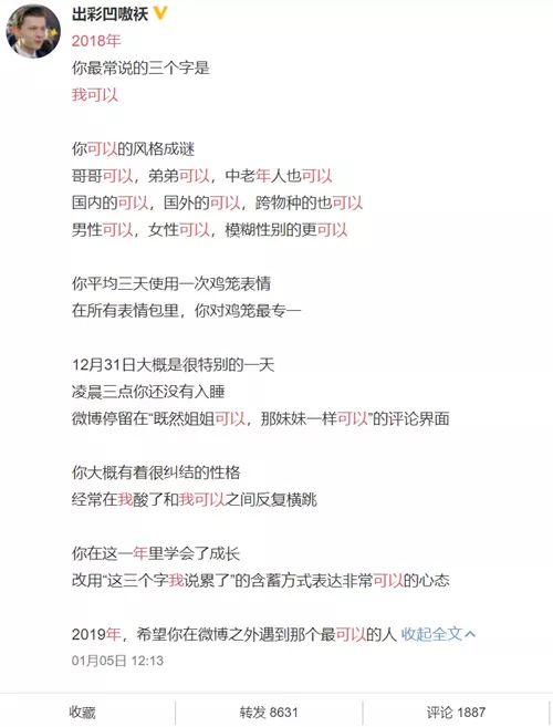 “我可以”這句話一般用來評(píng)價(jià)某個(gè)你很喜歡的人對(duì)你的吸引力過大,以至于你愿意為TA做任何事情。在顏性戀泛濫的如今,這句話經(jīng)常出現(xiàn)在微博等社交平臺(tái),除了直截了當(dāng)?shù)摹拔铱梢浴币酝猓€有一些常用搭配比如“姐姐可以,妹妹一樣可以”、“我可以這三個(gè)字,臣妾已經(jīng)說倦了”。