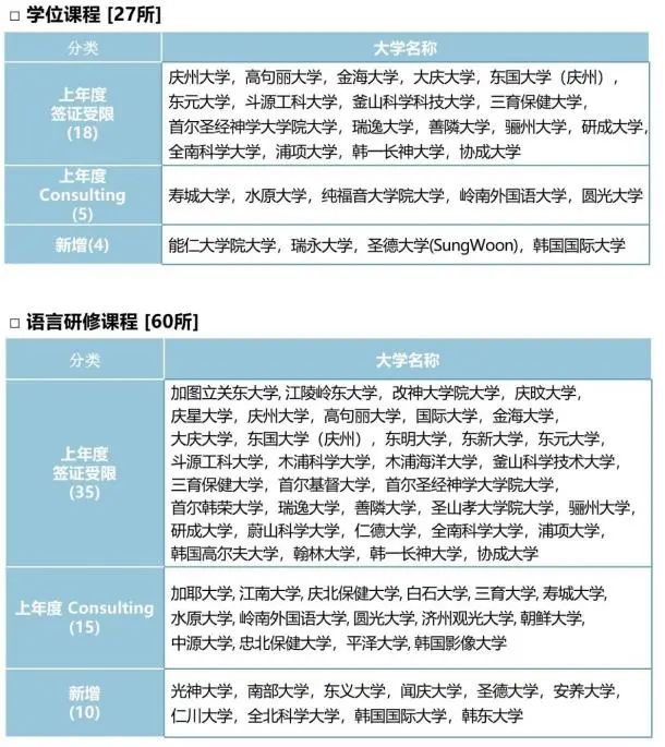 2015年3月,韓國(guó)開始實(shí)行認(rèn)證大學(xué)簽證簡(jiǎn)化手續(xù),每年都會(huì)公布一份當(dāng)年的最新簽證受限大學(xué)名單和優(yōu)秀認(rèn)證大學(xué)名單,由于名單存在變動(dòng),因此每年都會(huì)有一些學(xué)校加入認(rèn)證大學(xué)名單中了,也會(huì)有一些大學(xué)被從認(rèn)證大學(xué)名單中去除。