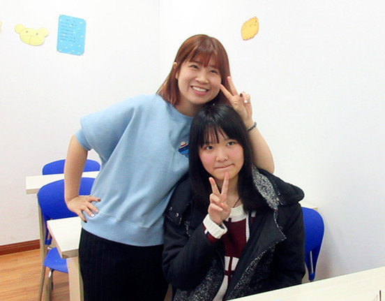 勾亞姍與法亞西班牙語老師鐘老師的課間合影。
