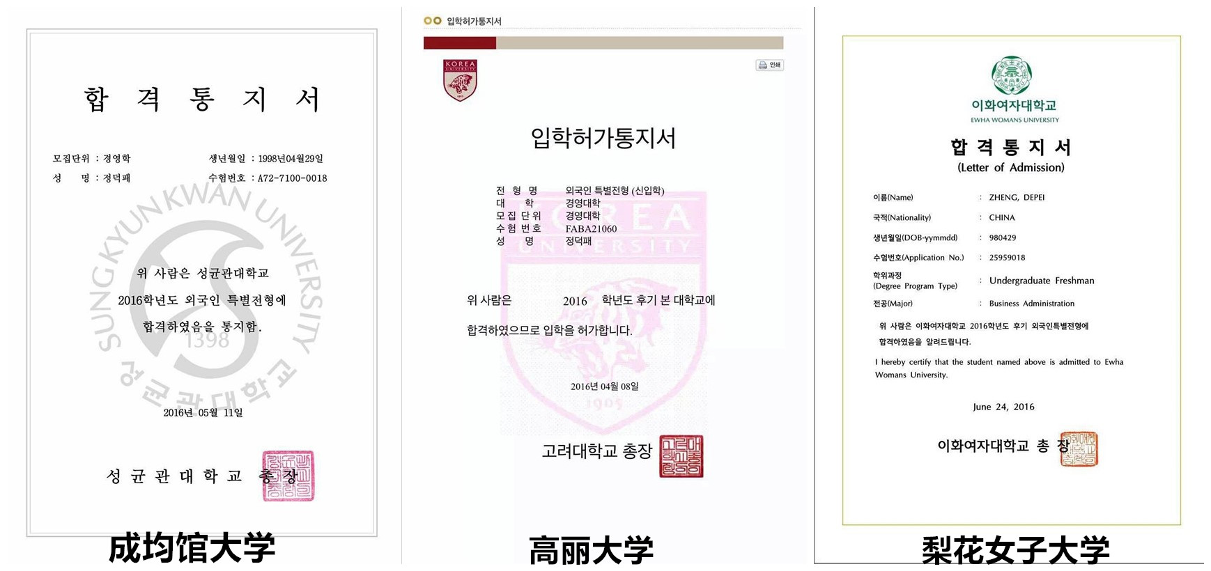 喜訊!我校韓語部學生鄭德沛同學同時拿到高麗大學、梨花女子大學和成均館大學三所韓國頂尖大學的經營系offer。