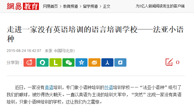 近日,一家沒有英語培訓,專門做小語種培訓的外語培訓學校——“法亞小語種”吸引了我們的眼球,被炒得熱火朝天。一直以英語為主流的培訓大軍中,“突然”出現(xiàn)一家沒有英語培訓,只做小語種培訓的學校,這讓我們?yōu)橹痼@。